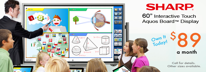 Now Available! Sharp Aquos Interactive Digital Boards. Check it out: 70" PN-L651H Interactive Display with 4K Ultra HD w/ wireless only $3,995 + tax or $99 lease options. Call for additional information.
